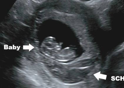Bleeding is common. It almost always arises from the placenta or placental margin (occasionally from the cervix). Placental bleeding may or may not form a subchorionic hemorrhage (SCH). Subchorionic hemorrhage may be very small and hard to visualize, or very large- even larger than the pregnancy. Older blood appears dark by ultrasound, more recent bleeding appears echogenic (brighter).