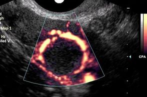 The corpus luteum shows typical features on ultrasound. The corpus luteum is a thick walled cyst with characteristic "ring of fire" peripheral vascularity. It usually has a crenulated inner margin and internal echoes. Identification of a corpus luteum is evidence that ovulation has occurred. On the other hand, failure to demonstrate a corpus luteum suggests that ovulation has not occurred.