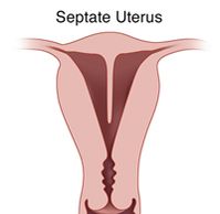 This malformation occurs when the uterine cavity is divided by a septum protruding from the fundus, but keeps the normal outer shape intact. A septate uterus is a common anomaly in women with a history of miscarriages and infertility. The septum is quite variable in length, but should be at least 1.5 cm. It forms a V shape, unlike the rounded U shape of an arcuate uterus. In some cases, the septum completely divides the uterine cavity and cervix into two halves. Resection of the septum can improve fertility and reduce the risk of preterm delivery for some patients.