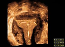 Low and mildly oblique position of an IUD seen on coronal 3D images.