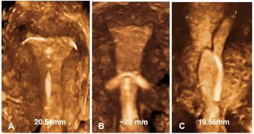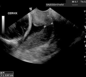 The closed cervix should measure at least 30 mm at this time- and is often over 40 mm (Caution: a full urinary bladder or focal uterine contraction can elongate the perceived cervical length and make it appear longer than it really is).
