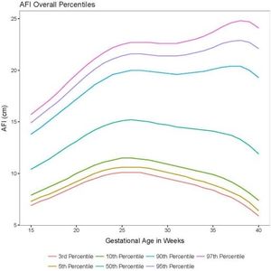 Note in the graph that the lower range for low amniotic fluid starts to decrease after 25 weeks, and can drop off quickly close to term. For this reason, amniotic fluid needs to be watched closely near term. Low amniotic fluid can lead to stillbirth, probably due to compression of the umbilical cord.