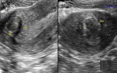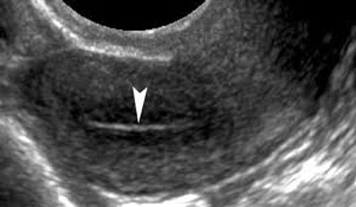 Endometrial polyps show as focal echogenic areas which obscure the normal central interface. A vascular pedicle, when present, helps to confirm a polyp.