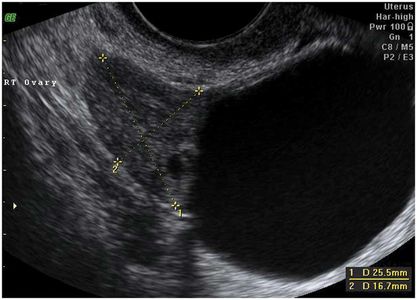 Most corpus luteum measure less than 5 cm. Sometimes we discover ovarian cysts which are larger than 5 cm, and which persist past 12 weeks. Ovarian cysts in pregnancy can be categorized as follows: